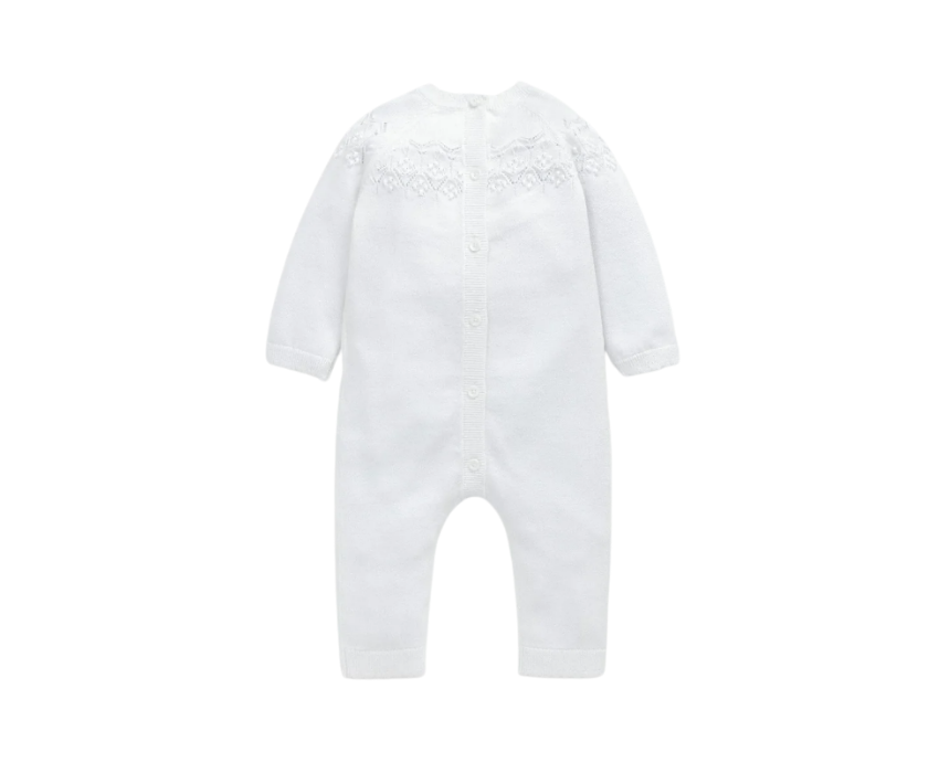 The Pointelle Knitted Romper is a cozy and stylish all-in-one outfit, crafted from soft pointelle knit for warmth on chilly days. It features a delicate knitted pattern, ribbed scalloped-edge collar, cuffs, and hems, and a front button fastening for easy dressing. Perfect for layering under jackets or wearing alone, it adds charm and comfort to a little one’s wardrobe.