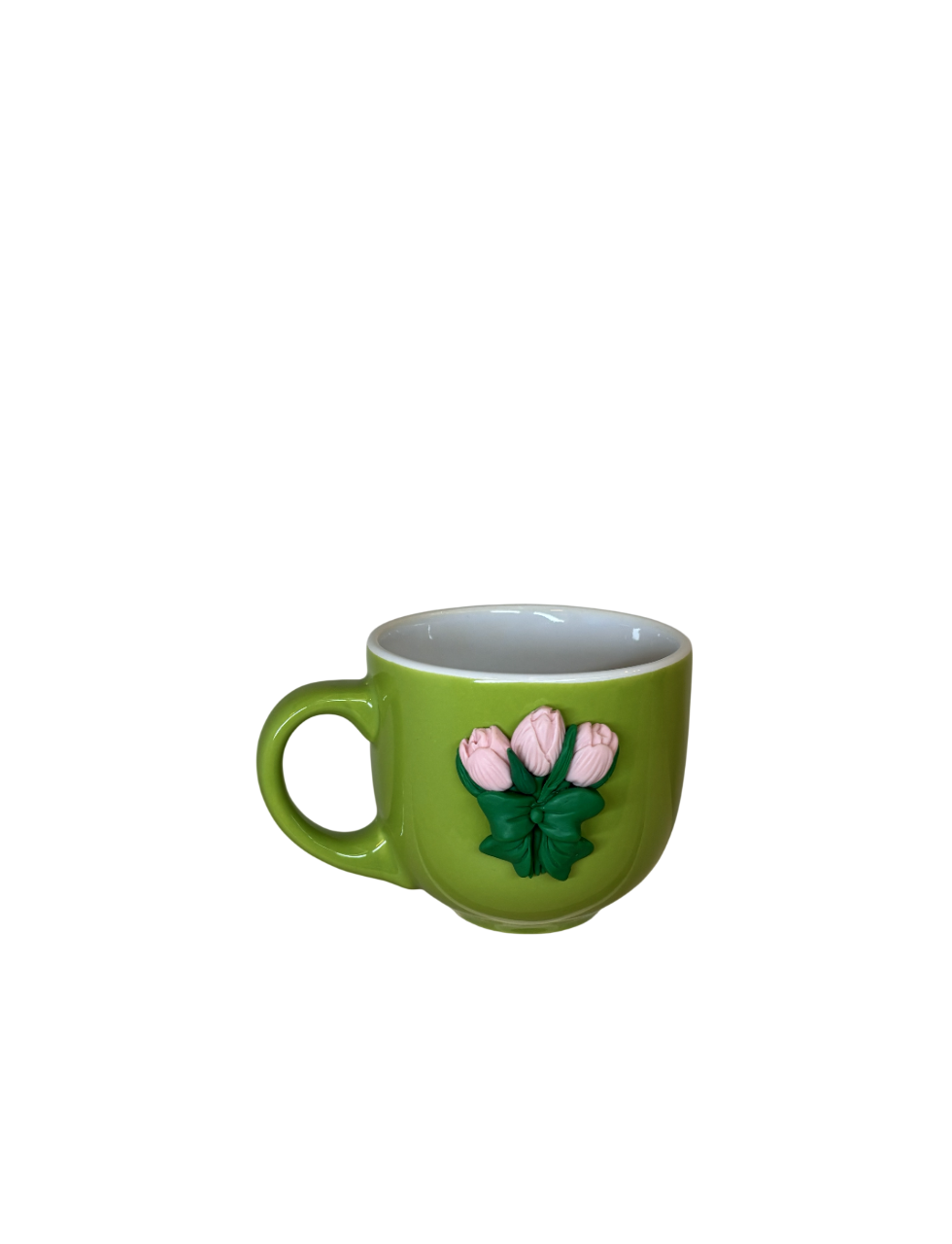 Handmade green mug decorated with soft pink tulips. Each piece is sculpted by hand for a unique, artistic touch. Perfect for floral lovers and customizable for gifts or personal style.