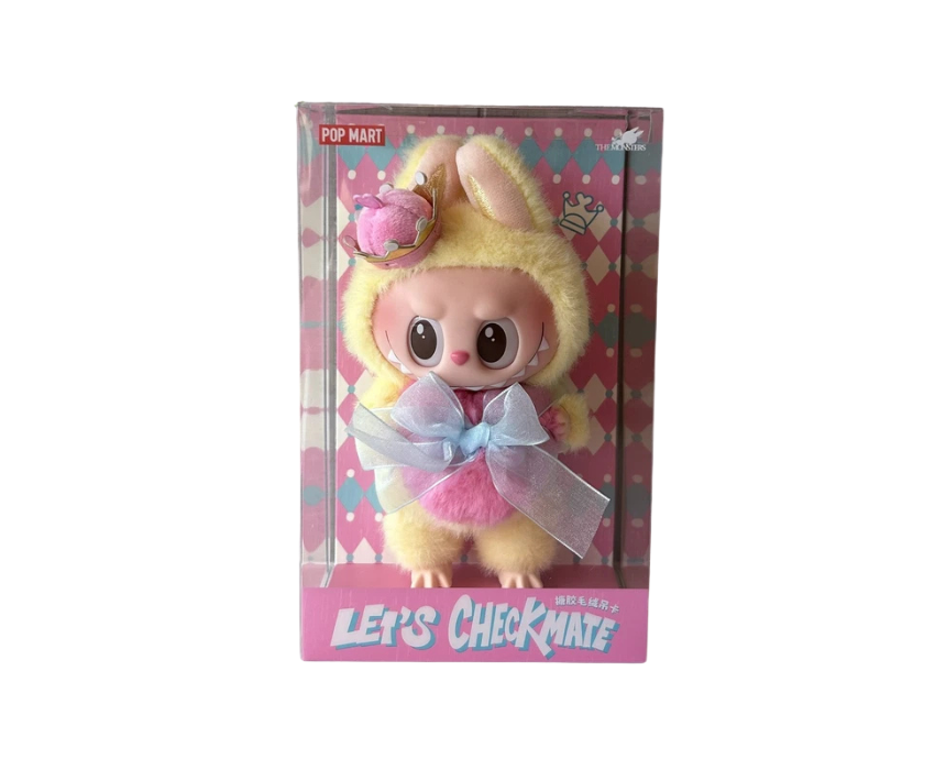 POP MART The Monsters Let’s Checkmate Labubu Series Vinyl Plush Hanging Card features an adorable Labubu dressed in a pastel bunny suit, clutching a rainbow heart and sporting a tilted crown. Each 100% authentic collectible from Pop Mart can be clipped to bags, keys, or displayed, adding a charming and playful touch to any collection.