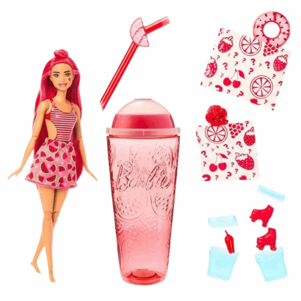 The Barbie Pop Reveal Fruit Series Strawberry Lemonade Doll delivers a fun sensory unboxing experience with eight surprises, including color-change hair and makeup, scented Slime, roller skates, and accessories. The set features a scented squishy pet, fruit-themed shorts, a fruit ring, and a mini squishy drink, encouraging imaginative play for kids aged 3 and up, with each doll sold separately.