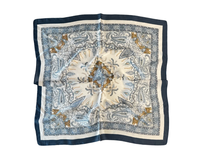 The Porcelaine du Printemps scarf features shades of blue with subtle golden accents on smooth synthetic satin, capturing the gentle awakening of spring in full bloom. Measuring 66 × 66 cm, it can be styled around the neck, as a headscarf, or tied to a handbag, pairing beautifully with a navy blazer or a flowing cream dress. Its elegant design adds a fresh, refined touch to any outfit.