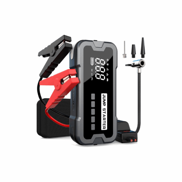 The 4 in 1 Portable Jump Starter Pro delivers 8000A of powerful performance, combining a jump starter, tire inflator, power bank, and LED emergency light in one compact device. It safely and quickly revives car or motorcycle batteries, inflates tires for vehicles and bikes, and charges devices through AC DC and USB ports. With SOS, lighting, and strobe modes, it ensures safety and reliability on every journey.
