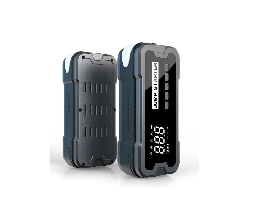 The 4 in 1 Portable Jump Starter Pro delivers 8000A of powerful performance, combining a jump starter, tire inflator, power bank, and LED emergency light in one compact device. It safely and quickly revives car or motorcycle batteries, inflates tires for vehicles and bikes, and charges devices through AC DC and USB ports. With SOS, lighting, and strobe modes, it ensures safety and reliability on every journey.