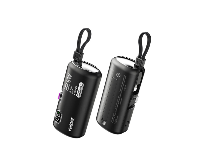 The 22.5W Super Fast Charging power bank delivers rapid charging with 5000mAh capacity, keeping your devices powered on the go. Featuring three fast outputs, one fast input, and an intelligent digital display for battery status, it ensures efficiency and convenience. Compact and portable, it includes a built in cable, lanyard, and phone holder, making it an all in one solution for travel, emergencies, or everyday use.