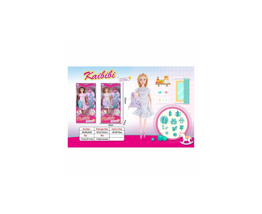 This adorable pregnant doll with brown hair and blue eyes wears a pink dress with black polka dots and blue shoes, perfect for imaginative play. The doll features an opening belly with a tiny baby doll inside and can switch from a pregnancy belly to a regular belly for endless storytelling. Suitable for children aged 3 and up, it encourages creativity and role play.