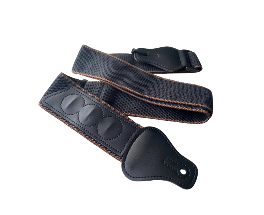 This premium adjustable guitar strap is designed for comfort and durability, featuring soft yet sturdy material with reinforced leather ends for secure attachment. It includes a convenient pocket to store picks, keeping musicians performance-ready at all times. Suitable for electric, acoustic, and bass guitars, its sleek black and brown design combines style and functionality for both stage and studio use.