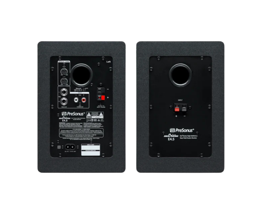 PreSonus Eris E4.5 powered studio monitors deliver clear, balanced sound with 25 watts of power, a 4.5 inch woven composite woofer, and 1 inch silk dome tweeter. Designed for home studios, content creators, and multimedia setups, they feature acoustic tuning controls for accurate mixing, recording, and everyday listening.
