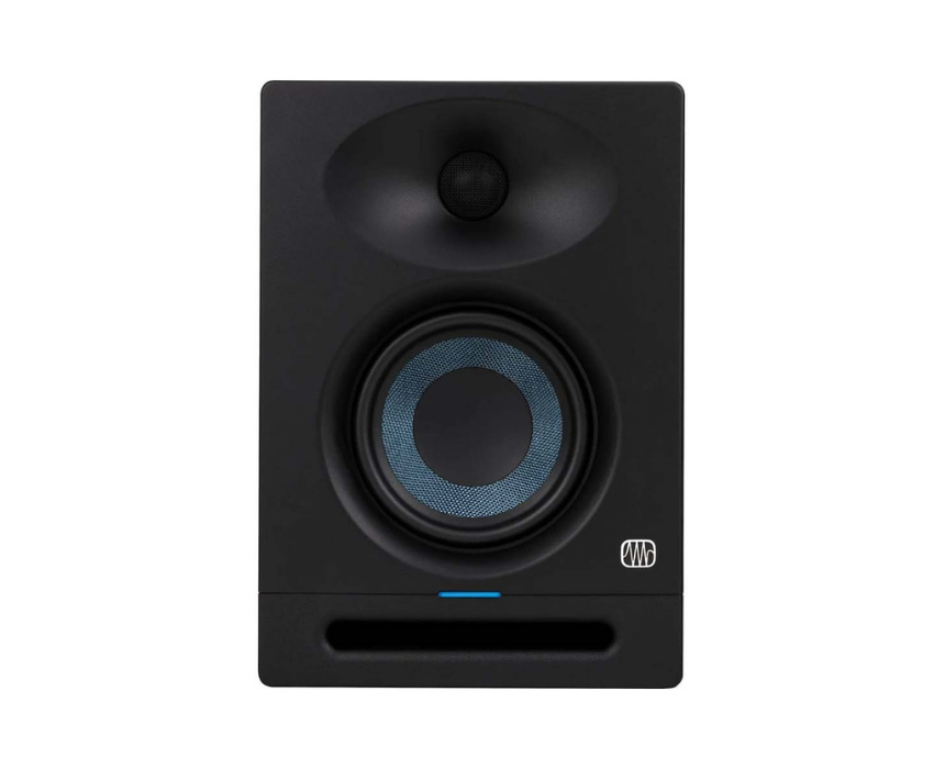 This professional 5.25 inch powered studio monitor delivers accurate and detailed sound with 50W Class AB bi amplification, a woven composite woofer, and a silk dome tweeter covering 48 Hz to 20 kHz. Acoustic tuning controls for high frequency, low frequency, and acoustic space adjustment help optimize room response, while a front firing bass port allows flexible placement. It includes XLR, TRS, and RCA inputs plus a front headphone jack for versatile studio monitoring.