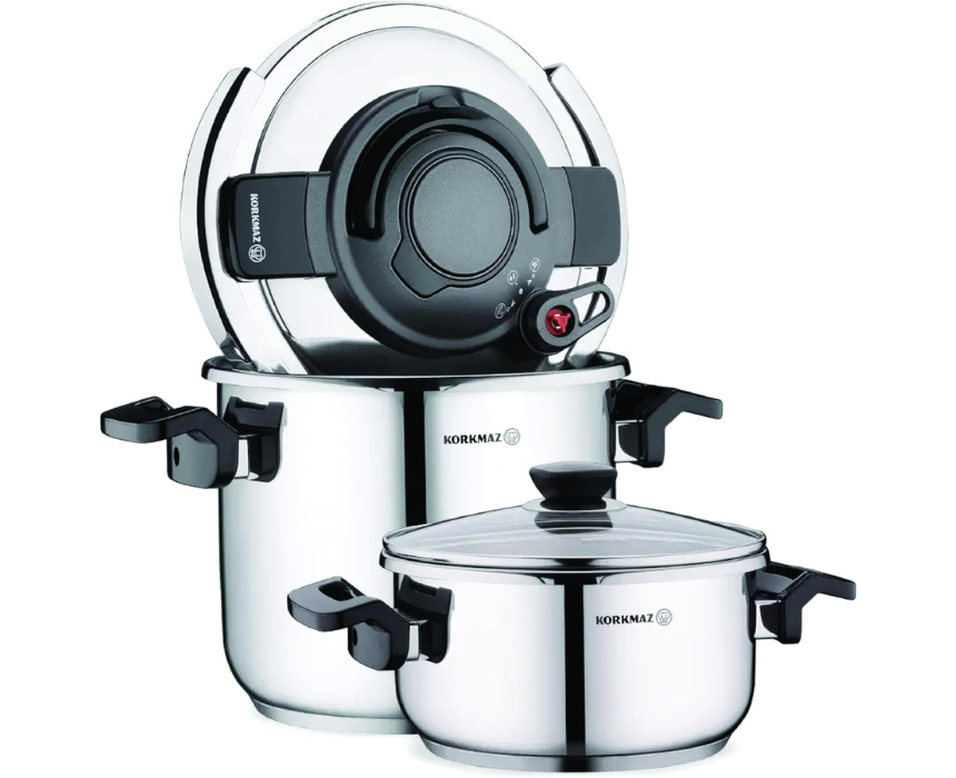 The Korkmaz Alessa 4-piece pressure cooker set includes a 4-liter pot and a 7-liter pressure cooker, crafted from durable 18/10 Cr-Ni stainless steel. Featuring an aluminum capsule base for even heat distribution and induction compatibility, it offers a 2-stage cooking pressure function with a common lid for versatile and efficient cooking. Ideal for everyday meals or professional-style cooking at home.