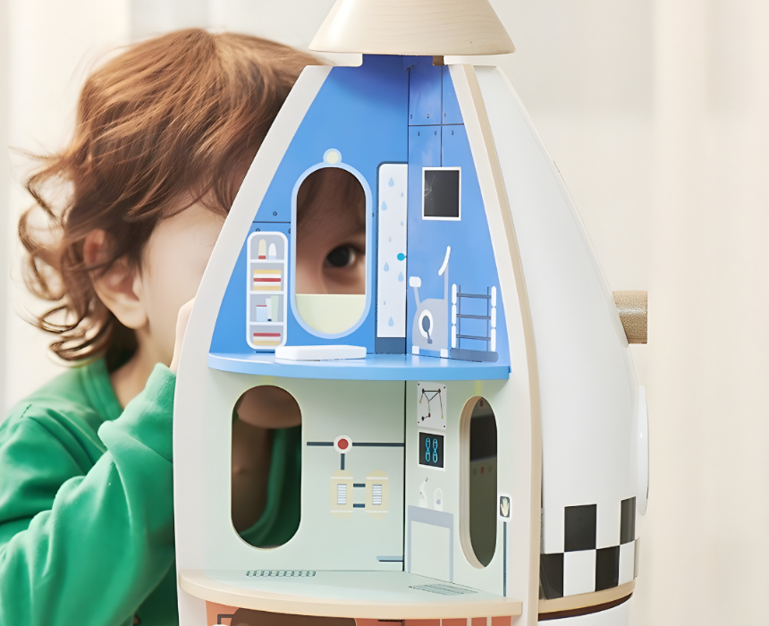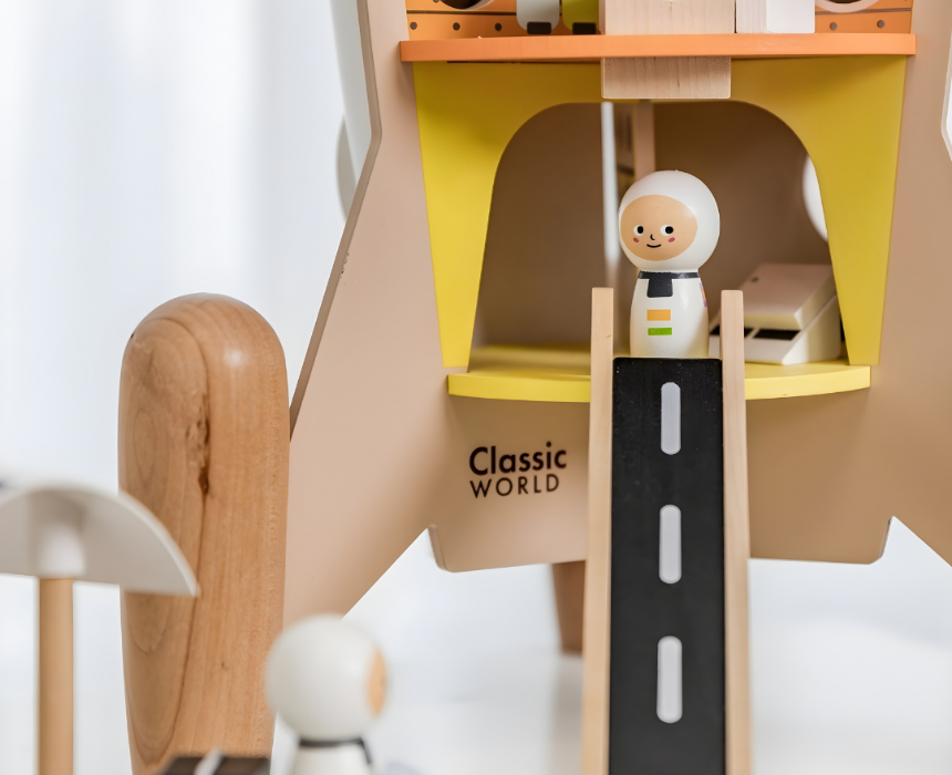 Classic World Wooden Space Rocket Set is designed for ages 3 and up and includes 51 pieces that combine construction play and imaginative role play. Children can build the rocket shells with screws, create expedition components using wooden sticks, and explore twelve themed rooms such as a bedroom, operation room, and laboratory. Perfect for floor play or playroom setups, it encourages storytelling, teamwork, and creative space adventures.