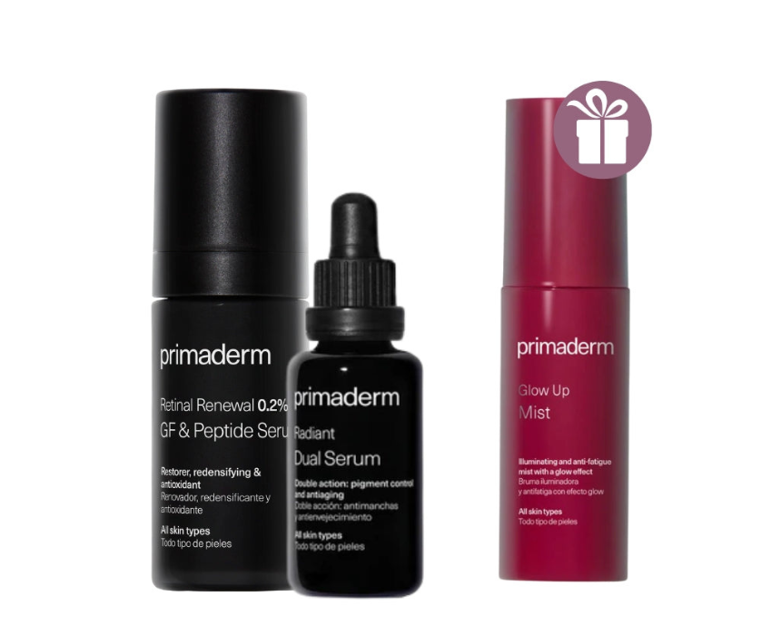 Primaderm Brightening & Anti-Aging Bundle combines a Radiant Dual Serum to even skin tone and boost radiance, Retinal Renewal 0.2% to target fine lines and improve texture, and a free Glow Up Mist for instant hydration and a luminous finish. Ideal for daily use, this set helps achieve a refreshed, radiant, and youthful complexion.
