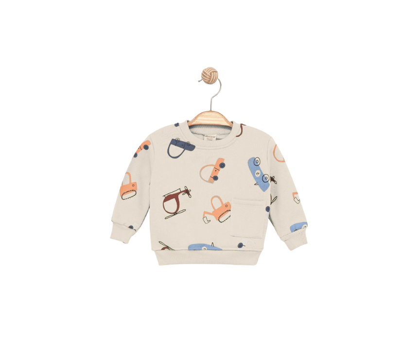 Comfortable printed sweatshirt for babies featuring a fun cars design in a soft light beige color. Crafted for everyday comfort, this sweatshirt offers a cozy fit and gentle feel on the skin, making it perfect for playtime, outings, and cooler days.