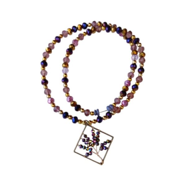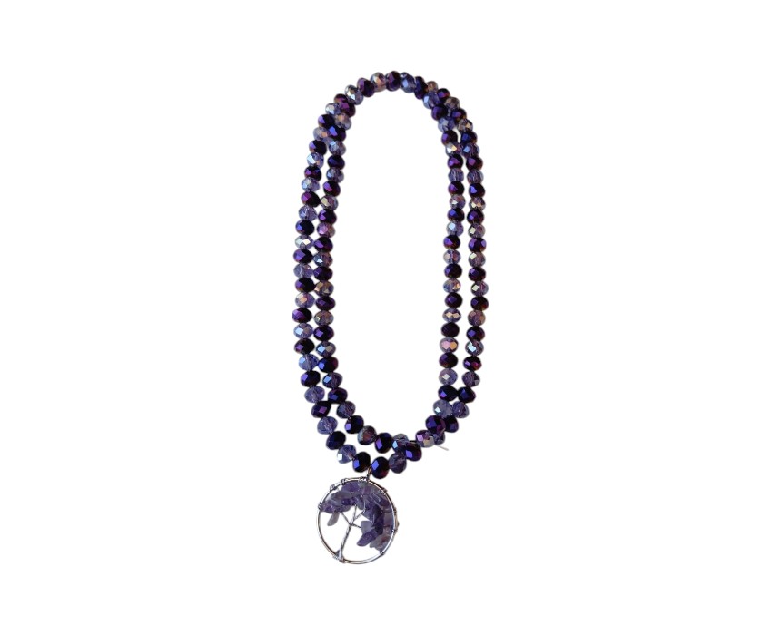 Celebrate nature with this long handmade necklace, crafted with purple and silver crystals. The centerpiece is a beautiful tree-shaped pendant accented with a silver round, symbolizing growth and elegance. The shimmering crystals reflect light beautifully, making it an ideal choice for evening wear or special gifts. This piece blends professional craftsmanship with a soulful design, ensuring you carry a piece of wearable art wherever you go. Fits all styles.