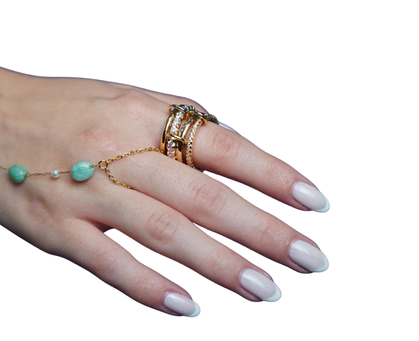 Quatro ring is a gold plated, multi layered ring featuring 4 connected layers, available in sizes 6, 7, 8, and 9 for a comfortable and elegant fit. Perfect for stacking with other rings or wearing alone as a bold statement piece, it adds a modern and luxurious touch to any outfit for everyday or special occasions.