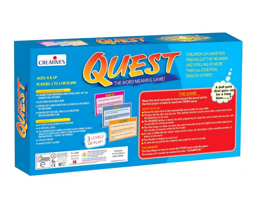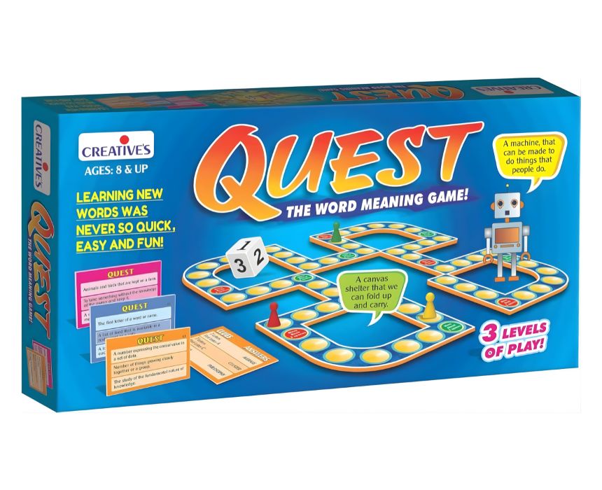 Embark on a knowledge-filled adventure with Quest: The Word Meaning Game. Designed for 2 to 4 players or teams, this challenging language game asks children to guess words based on specific definitions. As they play, they naturally expand their vocabulary and gain a deeper understanding of word usage. It is an excellent educational tool for both home and school environments, making language learning an exciting competition. A perfect gift for curious minds. Suitable for ages 8 and up.