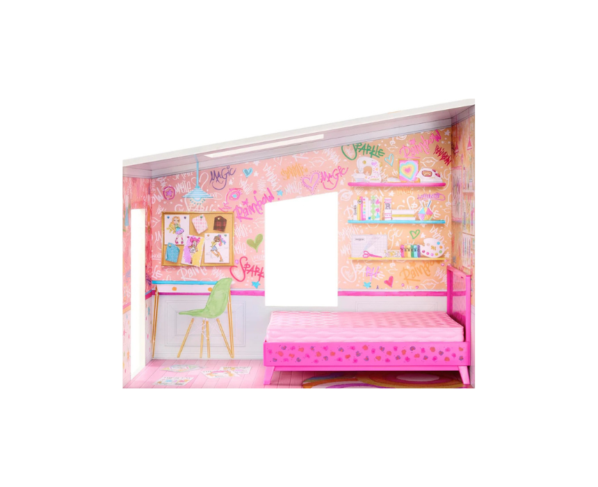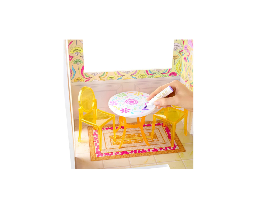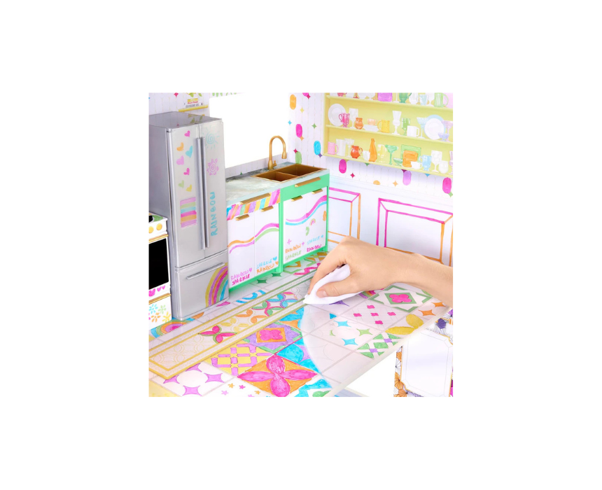 Rainbow High Color and Play House lets kids customize a fashion doll home with washable rainbow markers, coloring the walls and floors across 5 fully furnished rooms with essential furniture and storytelling accessories. The 360 degree design wipes clean for endless redesigns and is ready for imaginative play once decorated, making it easy to style the house to match any doll’s look or creative theme.