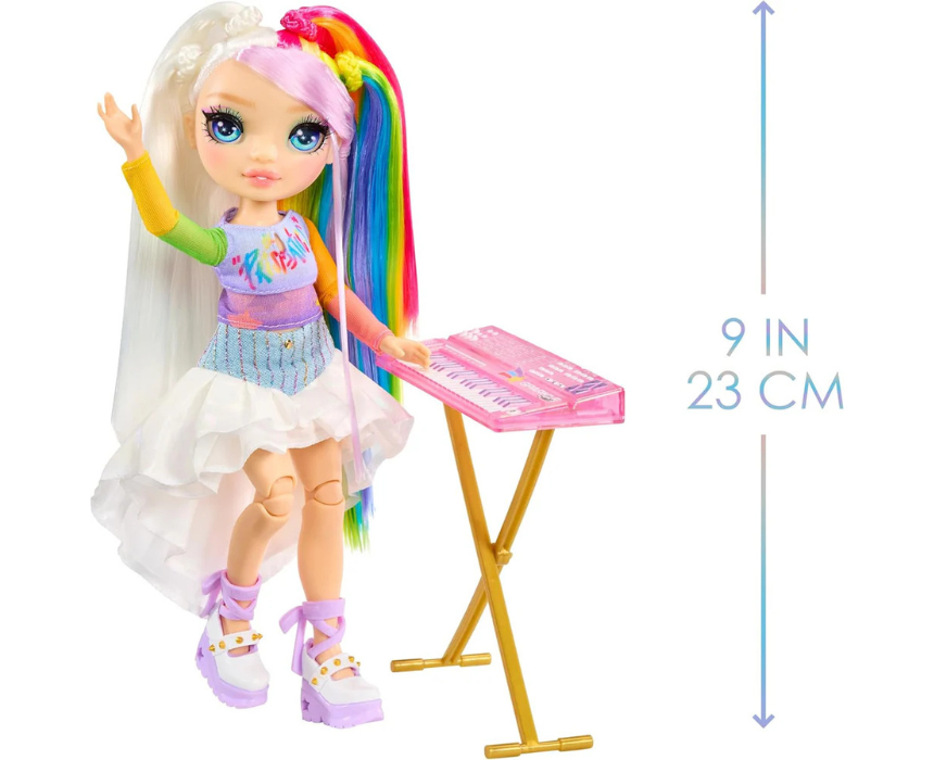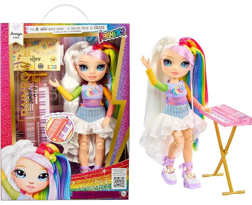 Rainbow High Junior High Rock Band Amaya Rainbow is a stylish collectible doll designed with trendy outfits and musical accessories for imaginative play. It encourages creative storytelling, role play, and mix and match styling, allowing children to recreate fun band performances. Perfect for solo play, sharing with friends, or expanding a doll collection, it offers hours of engaging entertainment.