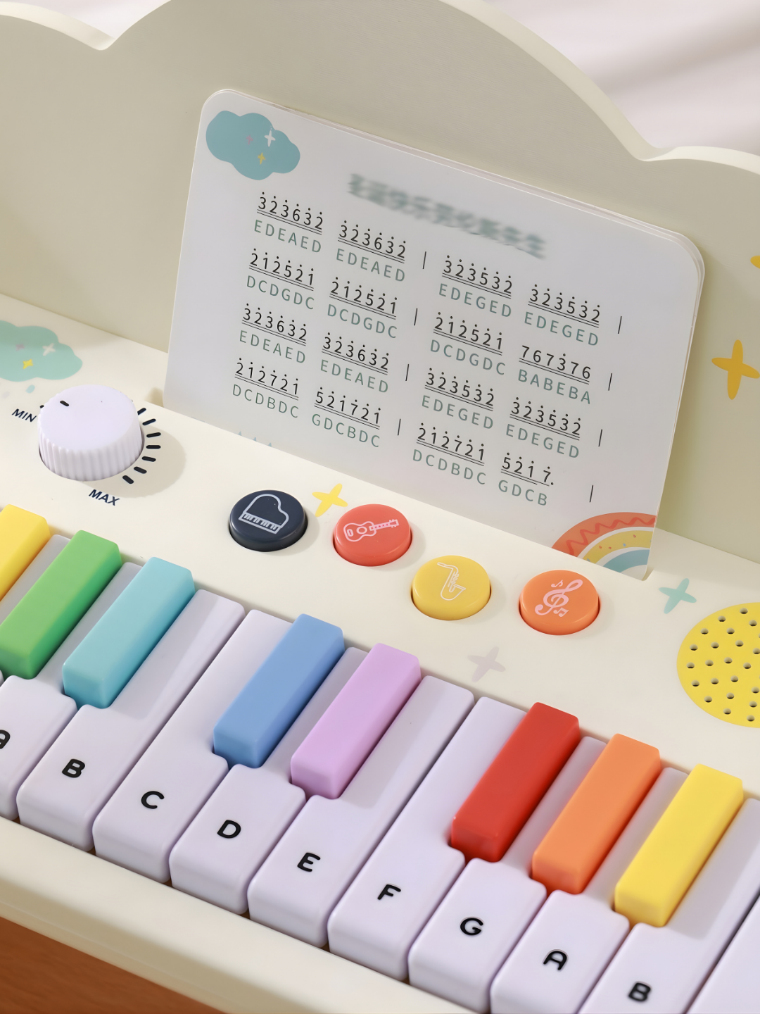 Introduce your little one to the joy of music with this elegant white rainbow piano. The keys light up when played. It also includes 6 teaching melodies. It uses light as a clue to gently guide small hands to play their first notes, building confidence and musical curiosity. Every key produces a clear, charming sound. The ideal first step into a lifetime of melody!