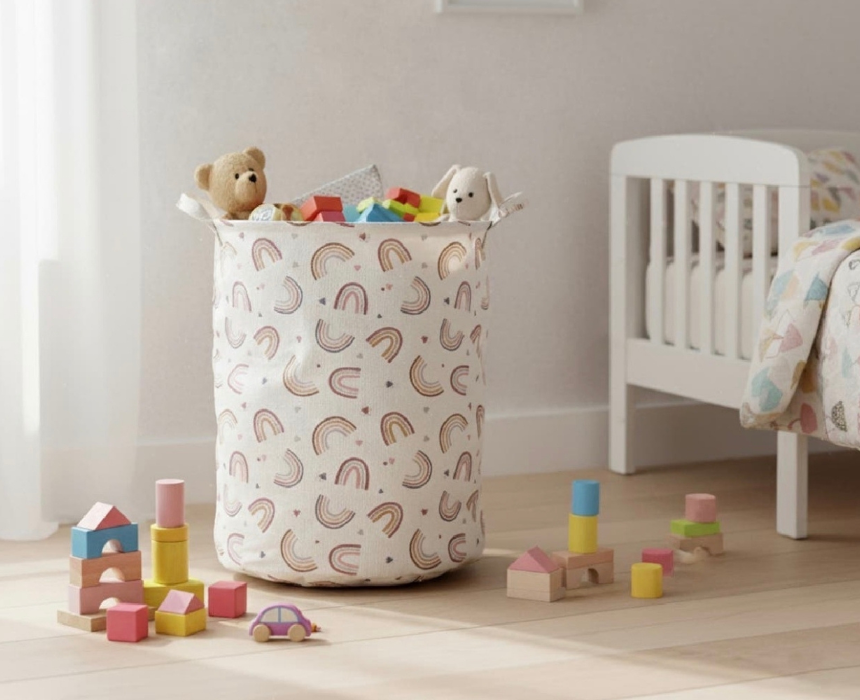 This round storage basket measures 40 x 40 x 50 cm and features a vibrant rainbow design. Lightweight yet durable, it is perfect for organizing toys, laundry, or household items. Adds color, personality, and a playful touch to any room while keeping spaces neat and tidy.
