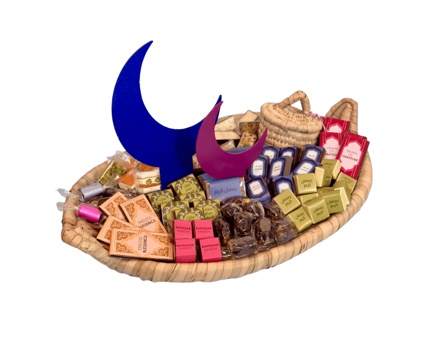 A festive selection of chocolates, dates, and traditional sweets presented in a beautifully arranged woven tray with crescent details. Perfect for hosting, gifting, or creating memorable Ramadan moments with family and friends.