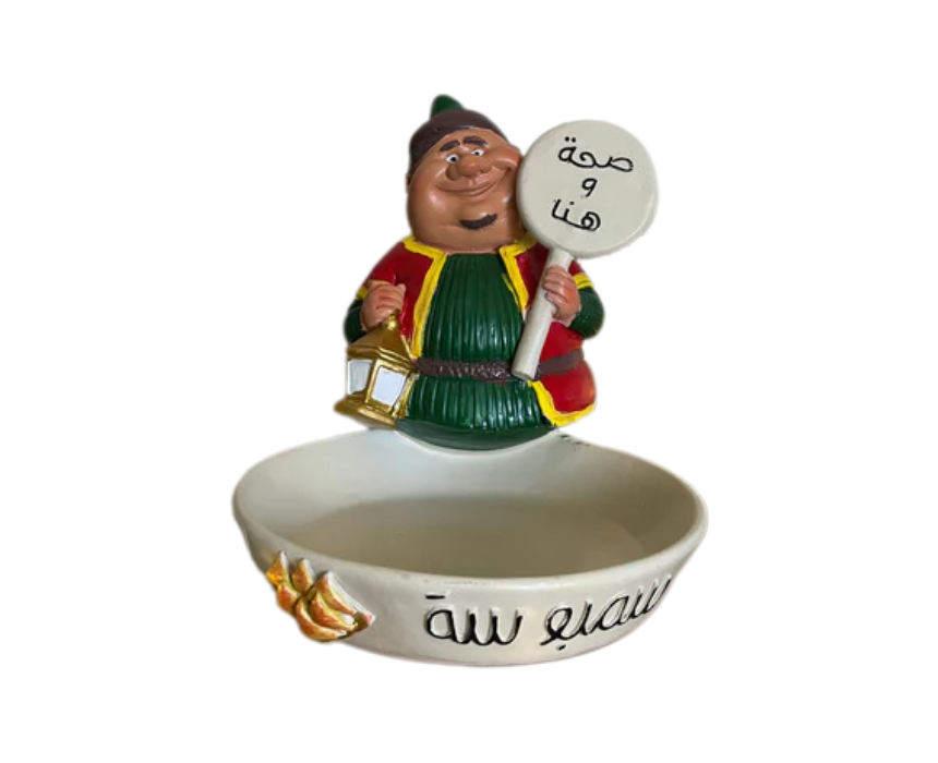 The Ramadan Character Decorative Plate “Saha w Hana” beautifully presents traditional Ramadan treats, combining cultural charm with practical design. Its artistic detailing makes it ideal for serving sweets while adding a festive touch to any table. Style it on dining tables or display shelves to enhance the celebratory ambiance of Ramadan gatherings.