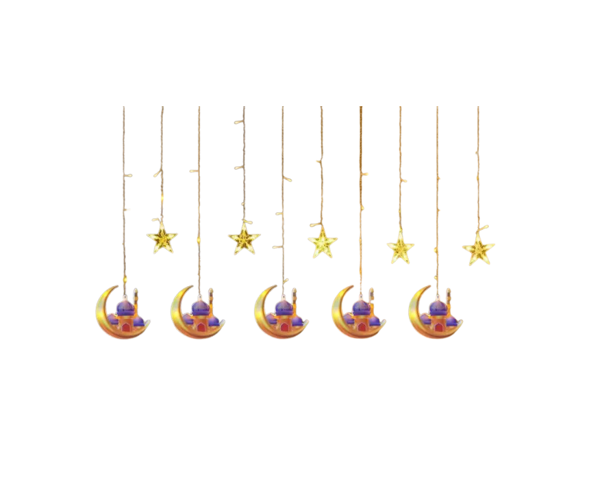 The Ramadan Colorful Mosque & Stars Lights feature a 3-meter string adorned with vibrant mosque and star shapes illuminated by warm yellow lights. Suitable for both indoor and outdoor use, they create a festive and inviting atmosphere for Ramadan gatherings and celebrations. Style them along walls, windows, balconies, or dining areas to instantly elevate seasonal décor.