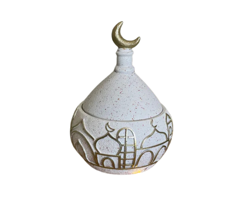 The Ramadan Covered Small Resin Plate is hand-painted with intricate Ramadan designs, making it both functional and decorative. Perfect for serving sugar, dates, or small confectioneries, it also serves as a thoughtful gift during the festive season. Style it on tables or display shelves to enhance your Ramadan décor with elegance and charm.