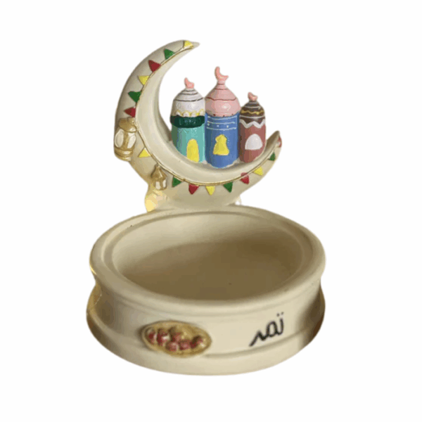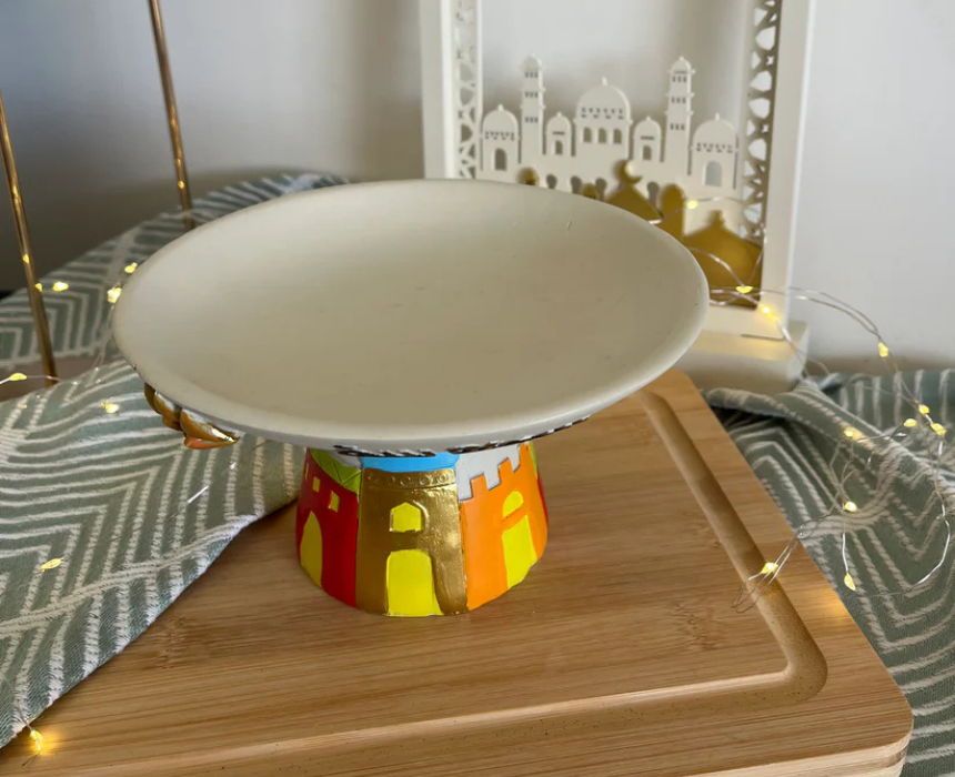 The Ramadan Decorative Colorful Resin Plate features a vibrant stand and high design, crafted for serving sambousa and other festive treats. Made from durable resin, it ensures stability while adding a colorful, eye-catching element to Ramadan gatherings. Style it as a centerpiece or pair with other festive serveware to elevate your seasonal table décor.