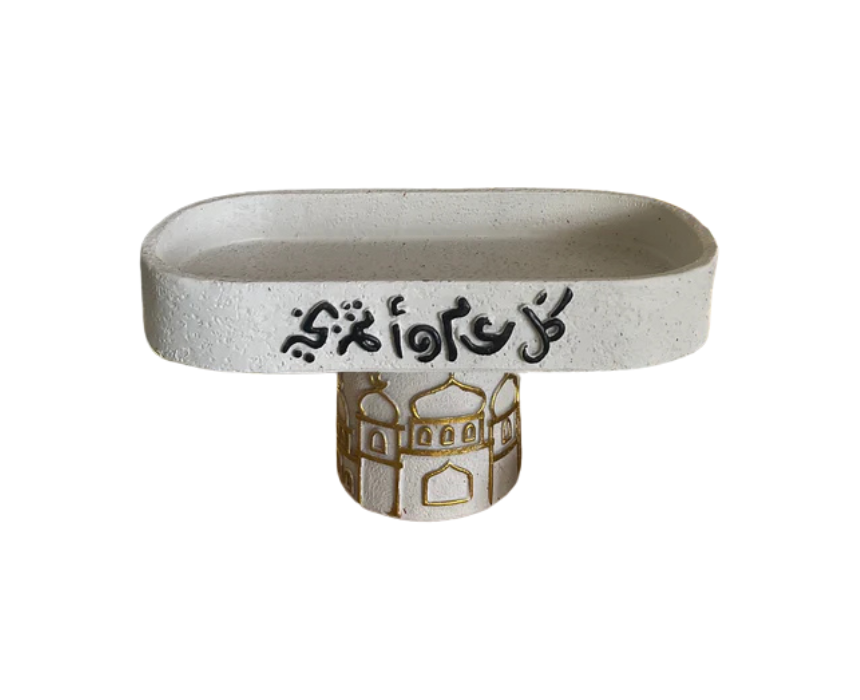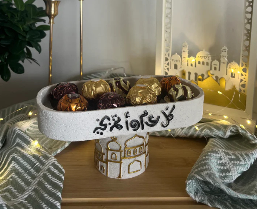 The Ramadan Decorative Plate features a soft neutral base with hand-painted details and elegant Arabic calligraphy reading “كل عام وانتم بخير,” blending tradition with modern charm. Perfect for serving dates or small treats, it adds a warm, festive touch to your Ramadan table while remaining versatile for everyday use. Style it as a centerpiece or display accent to elevate seasonal décor.