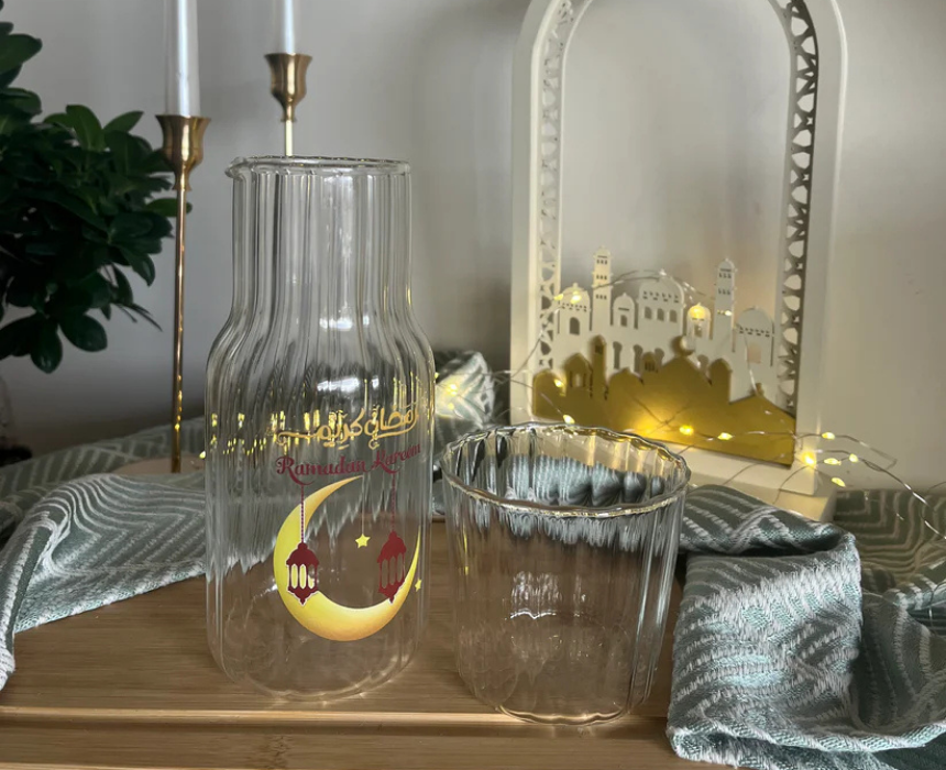 The Ramadan Glass Bottle & Cup Set includes a decorative glass bottle paired with a matching cup, designed to elevate beverage serving during Ramadan. Perfect for iftar gatherings, it combines style and functionality with durable, easy-to-clean glass. Style it on dining tables or serve individually to enhance festive presentations.