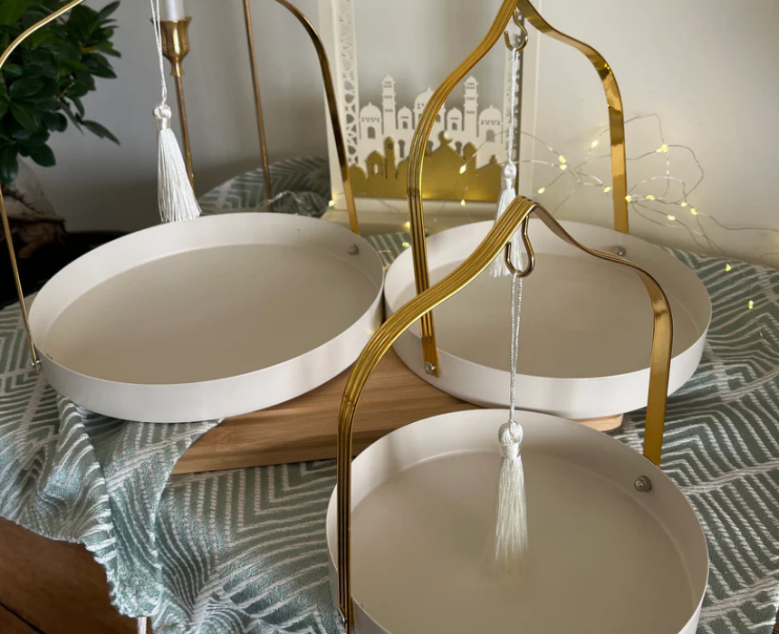 The Ramadan Metal Round Tray Set features three elegantly crafted metal trays, each adorned with a refined gold handle and decorative tassel. Designed for both serving and display, these durable trays blend functionality with timeless style, making them perfect for Ramadan gatherings or everyday hosting. Style them together as a layered centerpiece or use individually to serve sweets, dates, or coffee with sophistication.