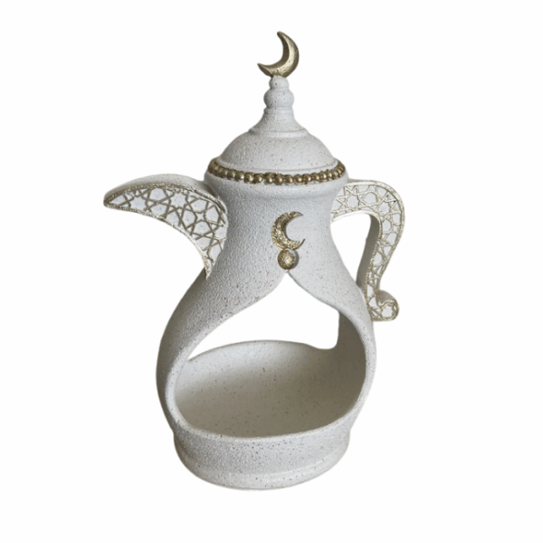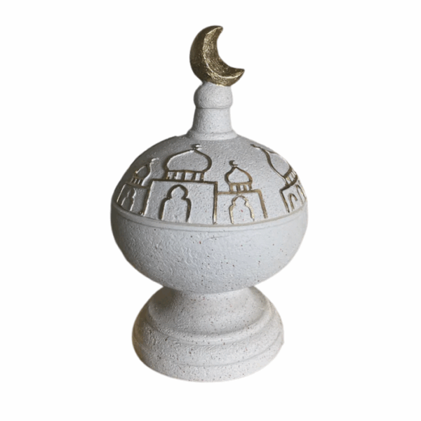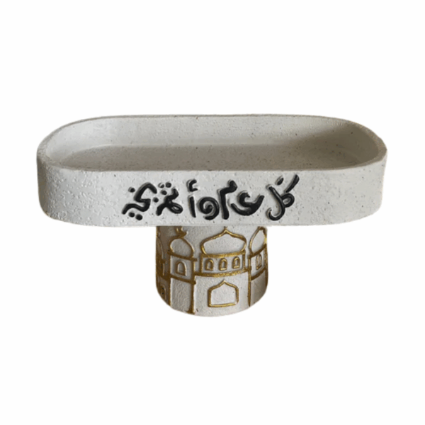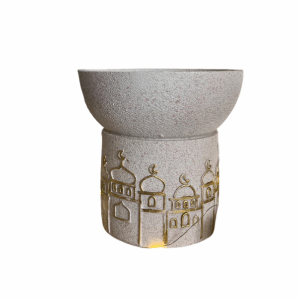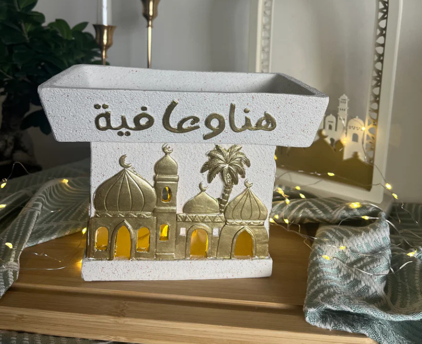 The Ramadan Resin Plate with Lights is a handcrafted decorative tray inspired by traditional Islamic architecture, featuring mosque domes, minarets, and palm tree motifs with elegant gold accents. Its soft stone-textured finish and warm LED lighting create a cozy, festive ambiance, while the Arabic phrase “هنا وعافية” adds a heartfelt touch. Perfect for serving dates, displaying sweets, or styling your Ramadan table, it blends tradition, warmth, and charm for décor or gifting.