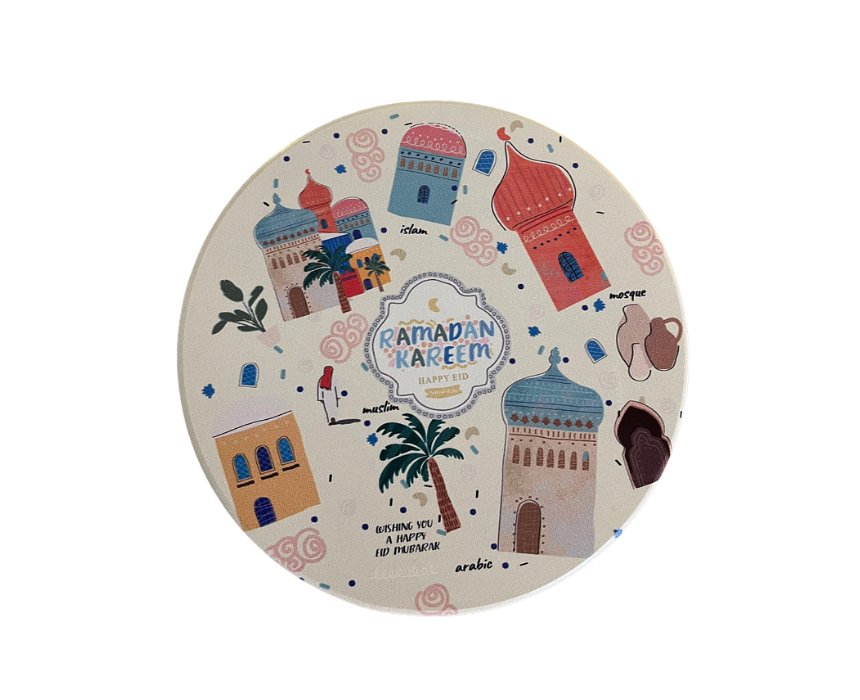 The Ramadan Round Stone Coaster, 19 cm in diameter, features three unique Ramadan-themed designs. Made from durable stone, it protects surfaces from heat and moisture while adding a festive decorative touch. Ideal for serving drinks during Ramadan gatherings, it combines functionality with elegance and long-lasting quality.