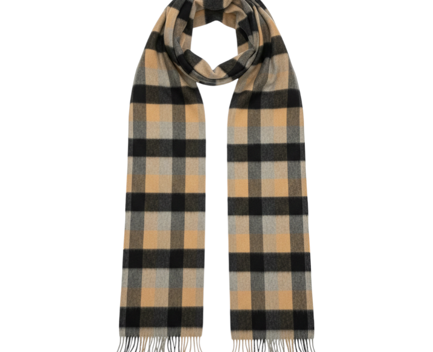 Wrap yourself in pure luxury with this 100% real wool shawl from inner Mongolia. Incredibly soft and exceptionally warm, this muffler has patterned blocks of navy, tan, and grey.