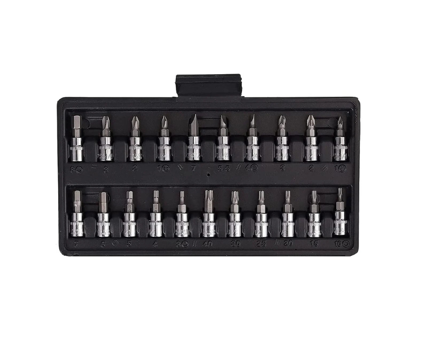 The Ratchet Set includes a 1/4 inch socket range from 4mm to 14mm with multiple driver bits for versatile repair tasks. Made from durable chrome vanadium steel, it ensures high strength and long lasting performance. The ergonomic non slip handle provides a comfortable grip, while the compact storage box makes it easy to carry and organize, perfect for home, automotive, and mechanical repairs.