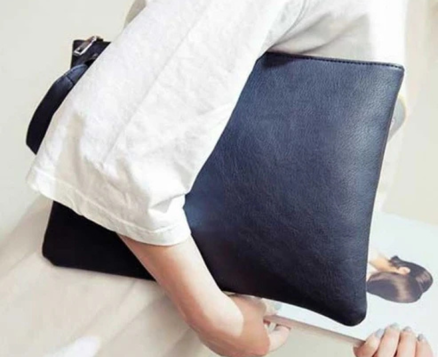 The rectangle black leather pouch with handle features a sleek, slim design crafted from leather, offering a minimalist silhouette with dimensions of 22x33x2cm for carrying essentials with ease. Designed to be carried by hand or tucked under the arm, it pairs perfectly with workwear, evening outfits, or polished everyday looks.