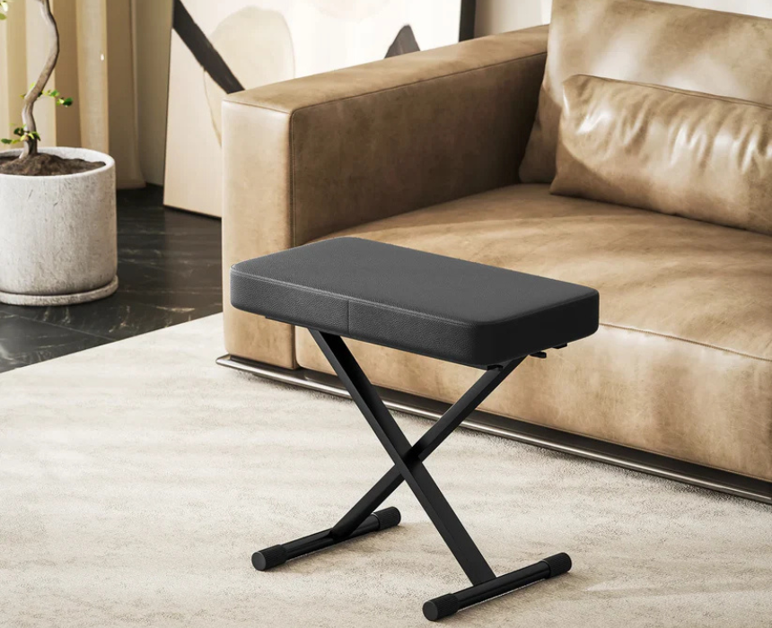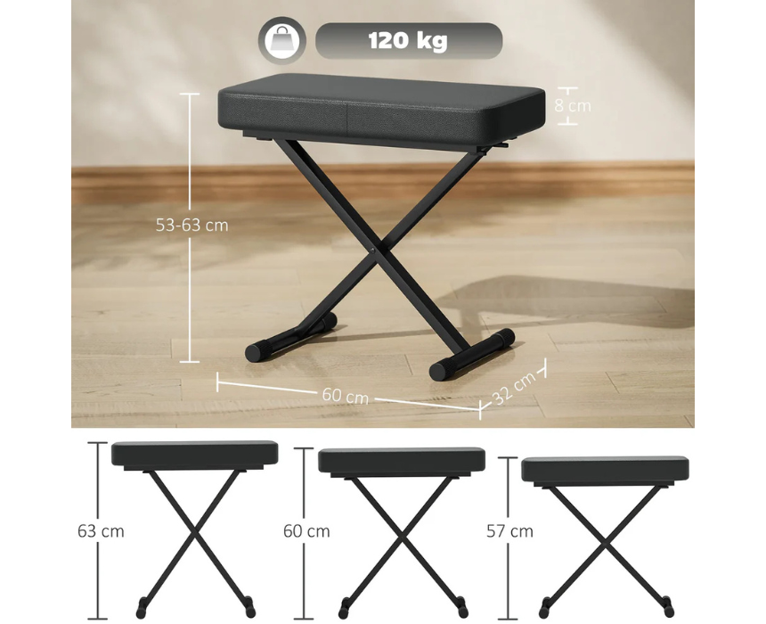 This stylish piano stool features padded PU leather upholstery for comfort and elegance, fitting seamlessly into any home, studio, or office. It offers four height adjustments from 53 to 63 cm, a foldable design for easy storage, and a durable X-shaped metal frame with non-slip feet and powder-coated legs, supporting up to 120 kg for stable, long-lasting use.