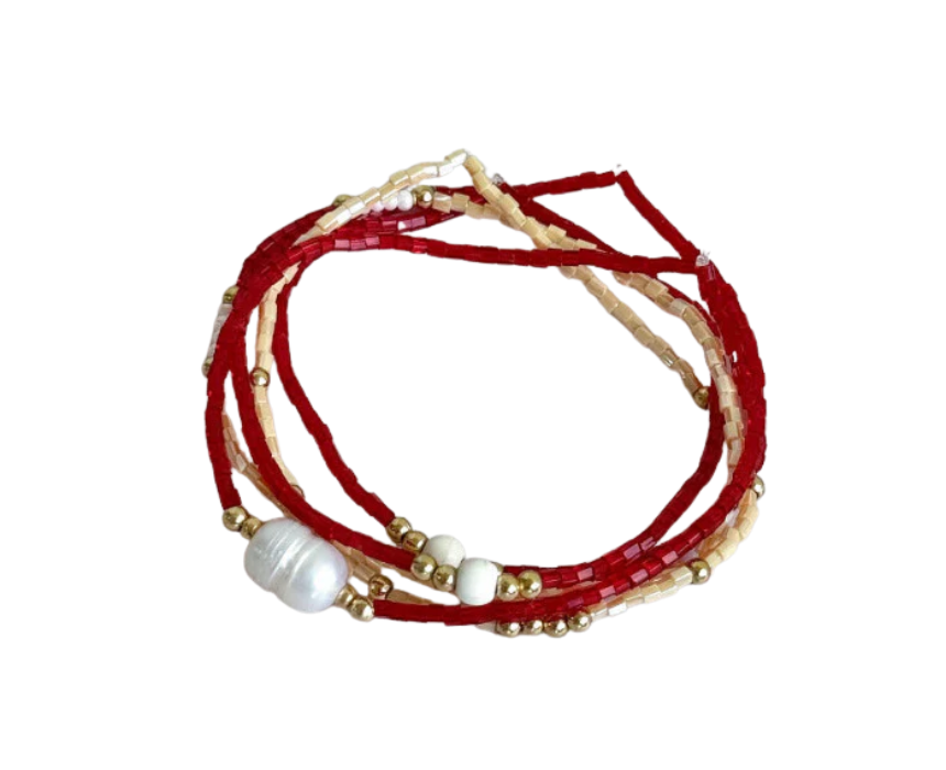 This bracelet stack combines red and beige tones for a warm and versatile accessory that complements a variety of outfits. The layered design adds texture and visual interest, making it perfect to wear alone as a statement piece or stacked with other bracelets for a personalized look. Ideal for casual or dressy occasions, it enhances any ensemble with subtle elegance and style.