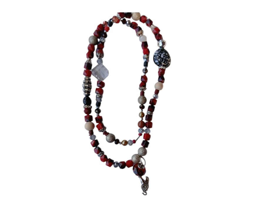 The “G. R.” is a long handmade necklace that features a striking combination of red and black cubic beads, wooden beads, and shining silver balls. Unique silver separators and a bold red pendant complete this sophisticated design. The contrast between the organic wood and polished silver gives this piece a modern, professional edge. Crafted to be durable and comfortable, it is a perfect statement piece for medical professionals or daily city wear.