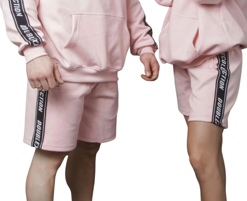 The XXATHLTCS regular fit shorts by doublexxcollection are a unisex cotton fleece essential featuring a comfortable regular cut, zippered pockets for practicality, a subtle XXATHLTCS rubber label at the end of the right pocket opening, and elastic side panels on both legs branded repeatedly with doublexxcollection text. Available in pink, they offer premium comfort with a playful athletic streetwear style. Style them with oversized tees, hoodies, or tank tops for a chic athleisure look.