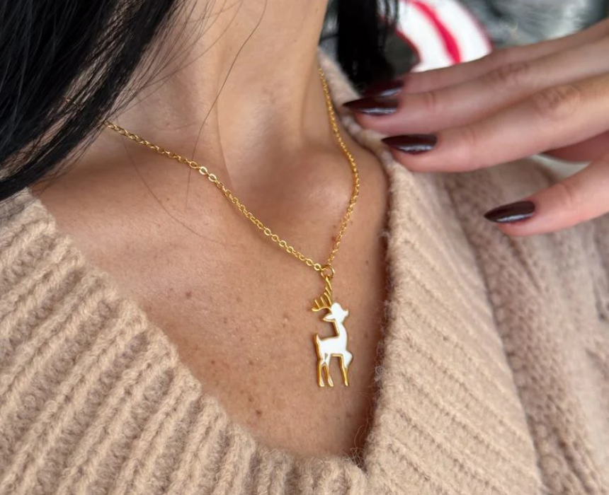 A festive necklace featuring a charming reindeer pendant detailed with smooth enamel for a playful holiday inspired look. This cheerful piece adds seasonal charm to winter outfits and is perfect for celebrations, gatherings, or everyday festive styling. It can be worn alone as a statement accessory or layered with other necklaces for a fun and stylish holiday look.