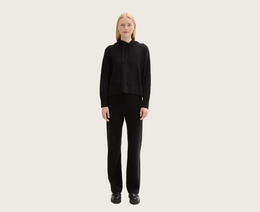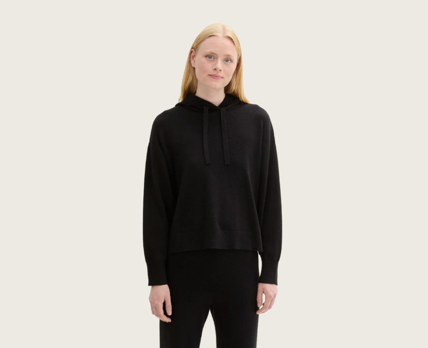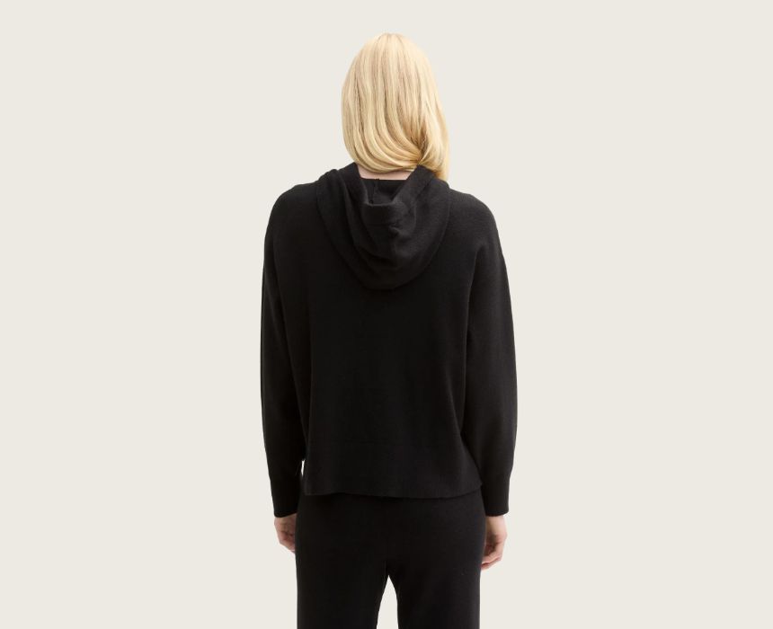 Elevate your casual wardrobe with the Tom Tailor Relaxed Knit Deep Black Hoodie. Designed with a relaxed fit, this knitwear piece combines comfort and style effortlessly. Featuring a hood and long sleeves, it’s perfect for layering or wearing on its own, offering a versatile look for any season.