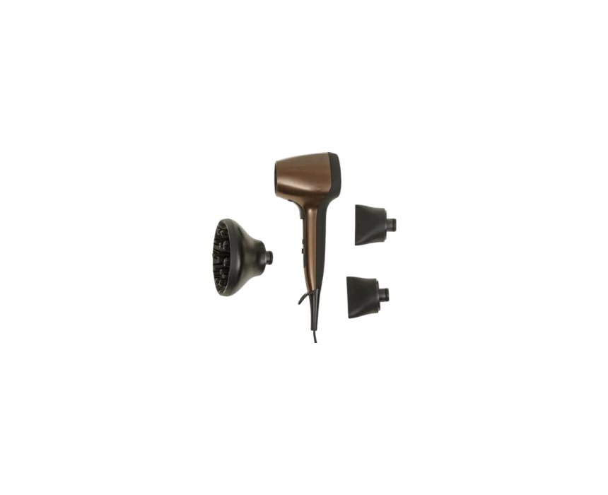 The Remington Air3D Hairdryer in bronze (model D7777) delivers powerful airflow and advanced drying technology to help dry hair quickly while enhancing smoothness and shine. Its ergonomic design ensures comfortable handling, and multiple heat and speed settings let you customize drying to your hair type. Ideal for everyday styling this hairdryer combines performance with dependable results.