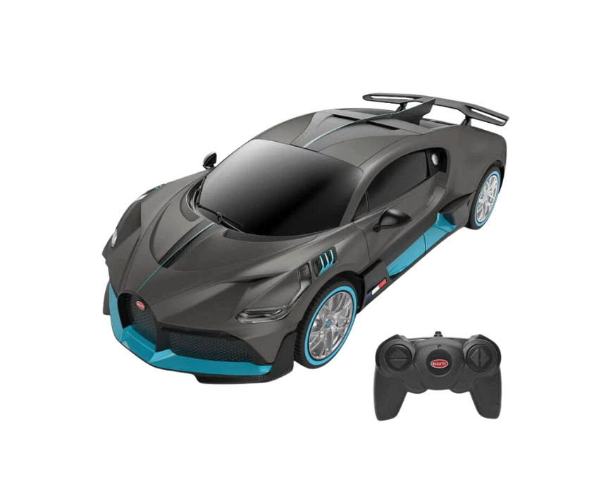 Officially licensed 1:24 scale Bugatti Divo remote control car by Rastar. Features forward/reverse, left/right turn, 5 mph speed, and 2.4GHz interference-free control. Designed with front shock absorbers, independent suspension, differential mechanism, rims, tires, and metallic finish. Measures 19.3 x 9.2 x 5.2 cm. Batteries required but not included. Factory-assembled and ready to run—perfect gift for collectors, kids, and Bugatti enthusiasts.