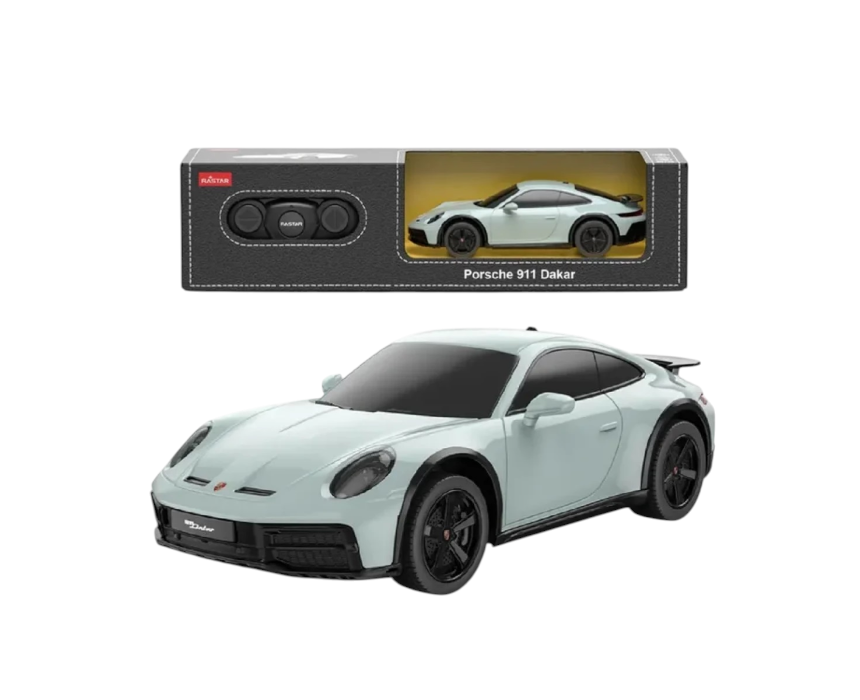 This 1:24 scale porsche 911 dakar rc car is inspired by the all-terrain version of the iconic model. it features detailed design, suspension, and 2.4 ghz control. suitable for indoor and outdoor play, ages six and up.