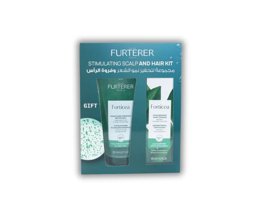 The Rene Furterer Stimulating Scalp and Hair Kit includes a 100ml Forticea Strengthening Tonic Lotion and a free 200ml Forticea Strengthening Shampoo designed to strengthen hair and revitalize the scalp. The tonic stimulates the roots while the shampoo gently cleanses, leaving hair healthy, strong, and full of vitality. Apply tonic daily to the scalp, massage gently, follow with shampoo as needed, and style hair as desired.