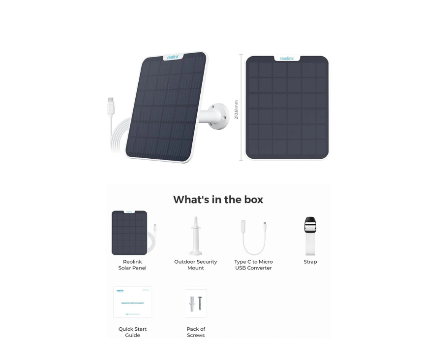 The Reolink Solar Panel 2 provides a stable and continuous power supply for compatible Reolink battery-powered security cameras. Its upgraded design offers improved sunlight absorption and weather-resistant durability for long-term outdoor use. Mount it in a sunny location to keep your camera charged and reduce the need for manual recharging.