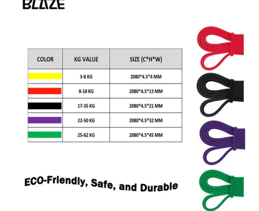 Blaze Latex Resistance Bands are high-quality long-loop training bands designed for strength, mobility, and full-body conditioning, ideal for warm-ups, assisted pull-ups, powerlifting, and rehabilitation. Made from durable latex, they are available in five resistance levels ranging from 3 to 62 kg, each measuring 2080 mm in length with varying widths for progressive resistance. Used by looping around hands, feet, or anchor points, they fit seamlessly into gym, home, or outdoor workouts.