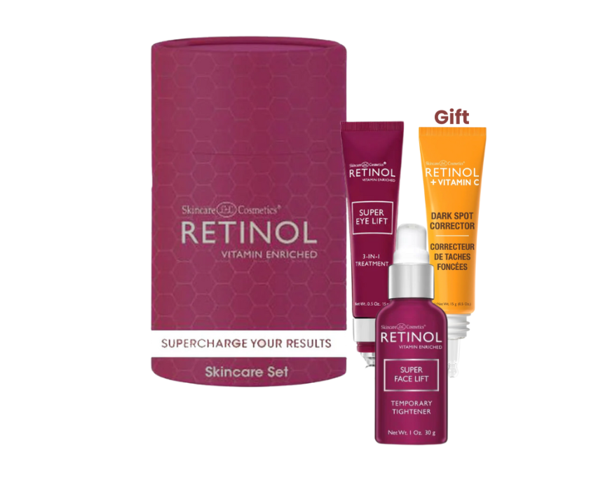 The Retinol Super Gift Set combines the Super Retinol Face Lift and Super Retinol Eye Lift with a free Retinol + Vitamin C Dark Spot Corrector for complete anti-aging and brightening care. It smooths and firms the skin, reduces fine lines, lifts and brightens the eye area, and targets dark spots for a more radiant, even complexion. Apply in the evening and follow with sunscreen during the day for optimal results.