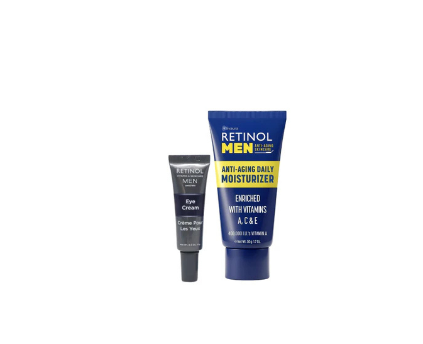 The Skincare Cosmetics Retinol Men Youth Renewal Duo includes a 50g daily moisturizer and a 15g eye cream designed to reduce signs of aging and promote youthful, refreshed skin. The moisturizer hydrates and strengthens skin while the eye cream targets fine lines and puffiness. Apply daily after cleansing, gently massaging onto the face and around the eyes for best results.